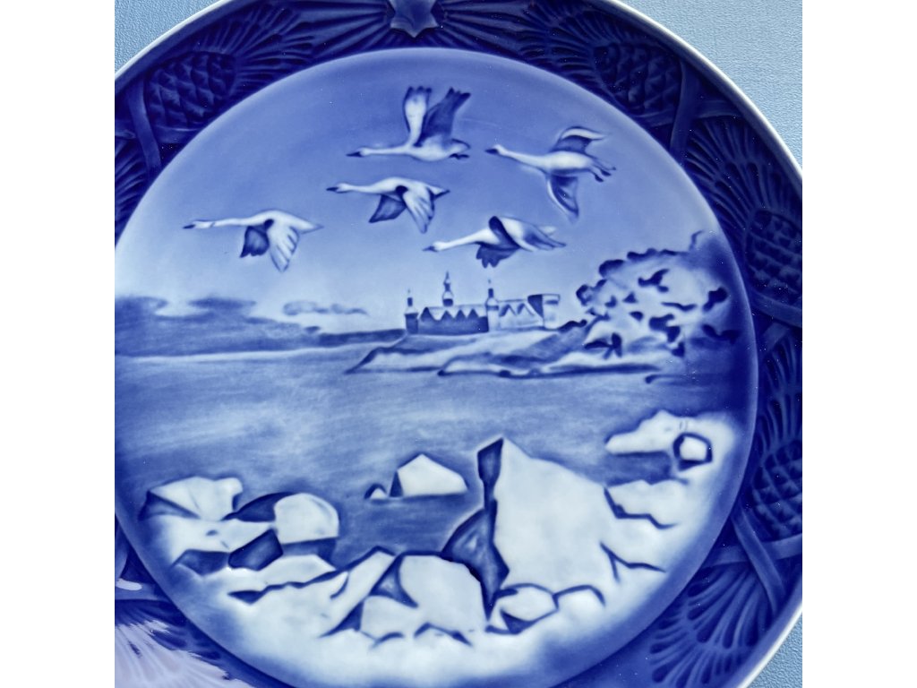 Přední stranu talíře zdobí tichá zimní krajina se zasněženým pobřežím a letícími husami.