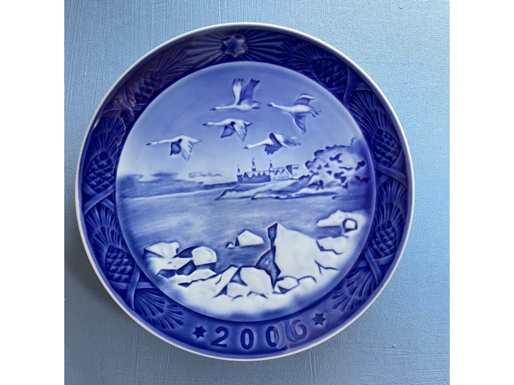 Vánoční talíř z roku 2006 pochází z manufaktury Royal Copenhagen, což potvrzuje zadní značka s korunou, nápisem Royal Copenhagen Denmark a třemi modrými vlnkami, které symbolizují dánské vody.