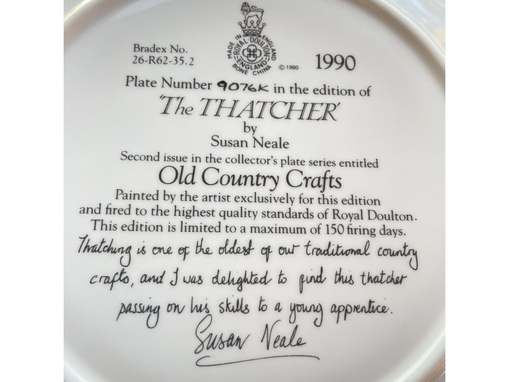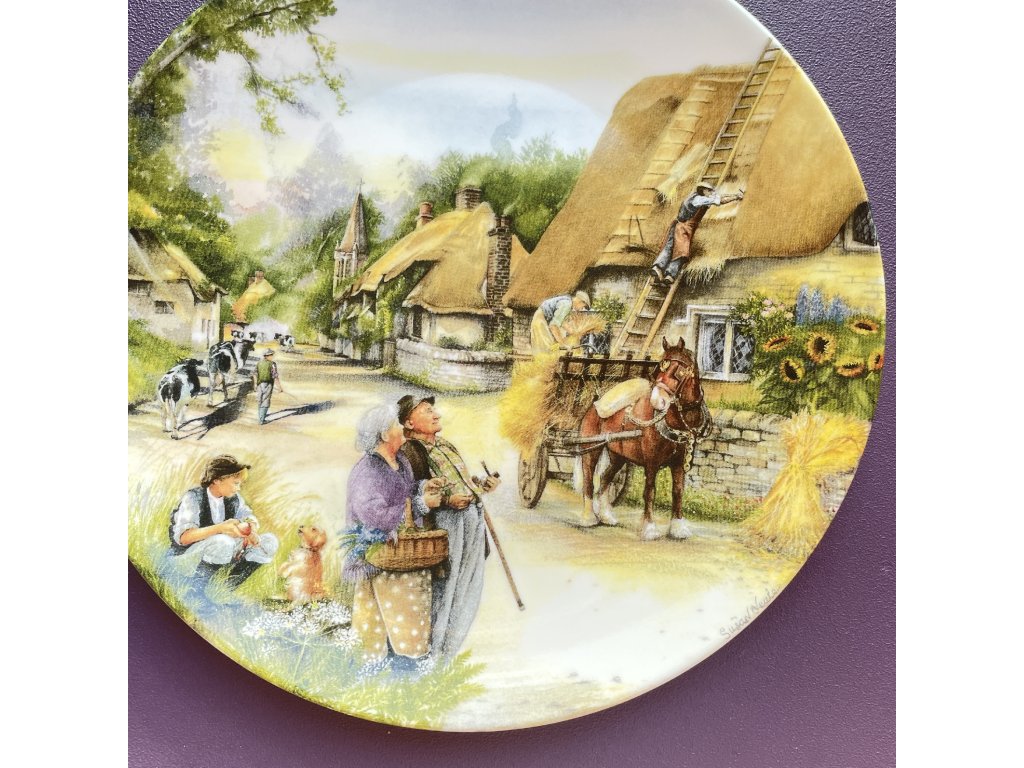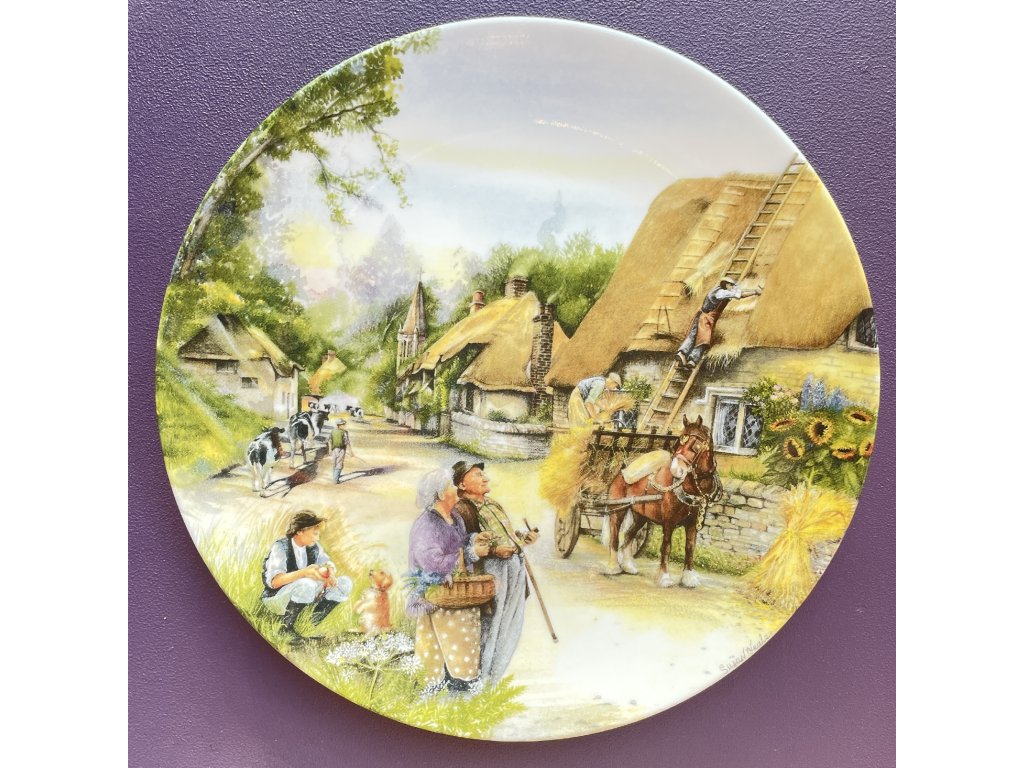 Sběratelský porcelánový talíř s názvem „The Thatcher“ představuje tradiční anglickou vesnickou scénu se zaměřením na starobylé řemeslo doškování střech.