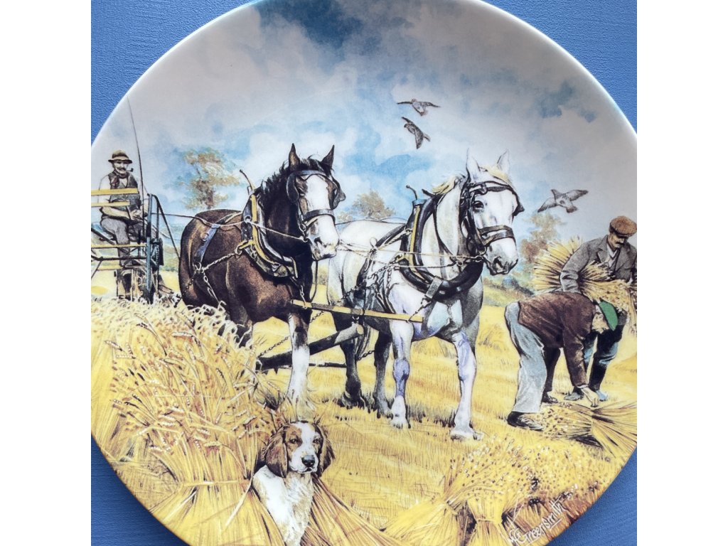 Talíř zachycuje tradiční zemědělskou scénu sklizně obilí s pomocí tažných koní, jak bývalo běžné ve venkovských oblastech Anglie.