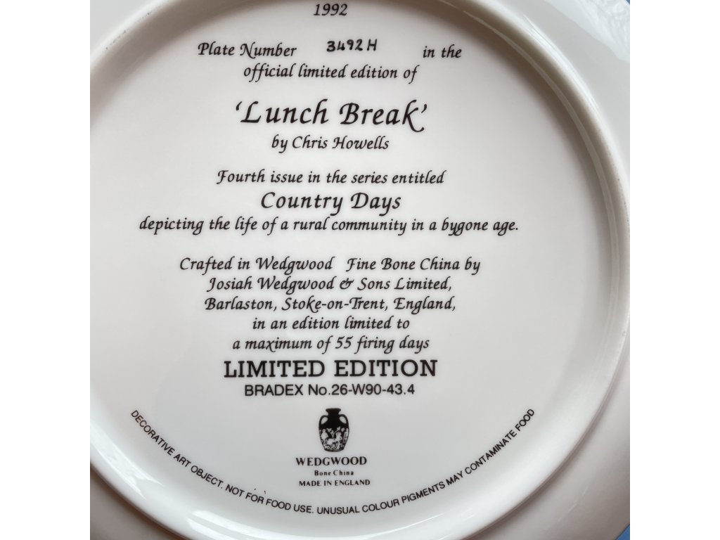 Dekorativní sběratelský talíř Lunch Break pochází z oficiální limitované edice vydané v roce 1992 a představuje čtvrté vydání ze série Country Days, která se tematicky zaměřuje na život venkovské komunity v minulých dobách.