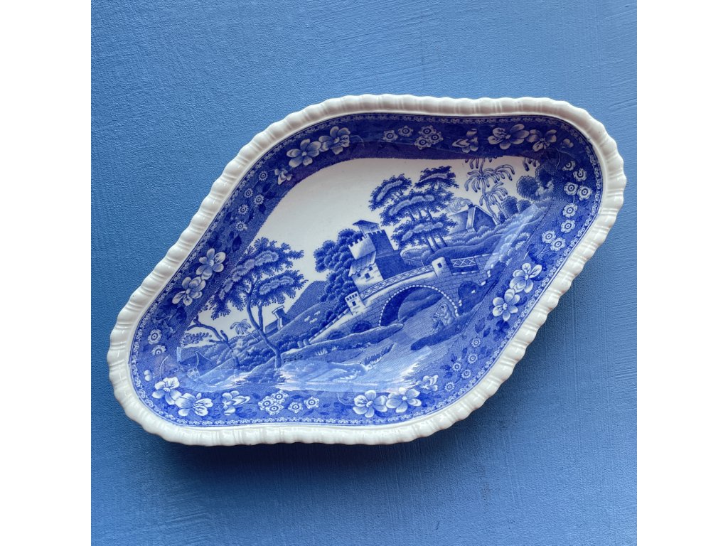 Dekor je soustředěn do vnitřní plochy, kde dominuje klasický modrobílý přenosový tisk zobrazující malebnou krajinu s mostem, říčkou, věžovitými stavbami a okolní přírodou.