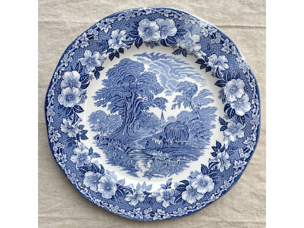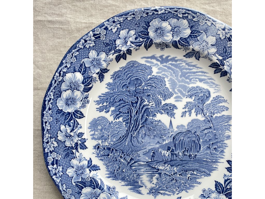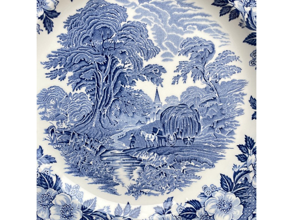 Servírovací talíř v klasickém modrobílém transferovém dekoru s bohatě zdobeným okrajem, který rámuje jemnou krajinářskou scénu ve středu.