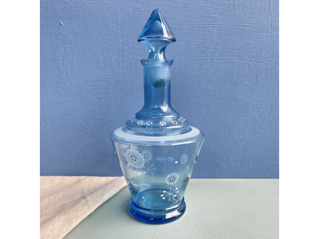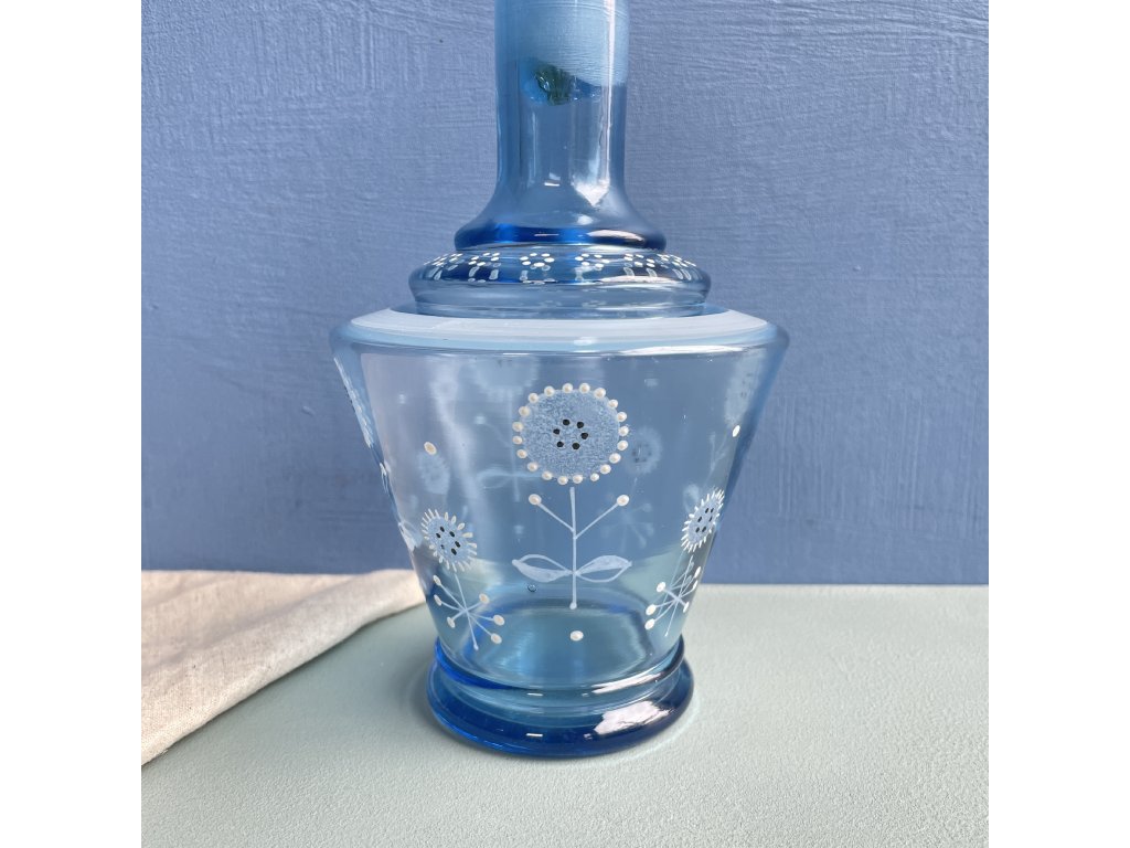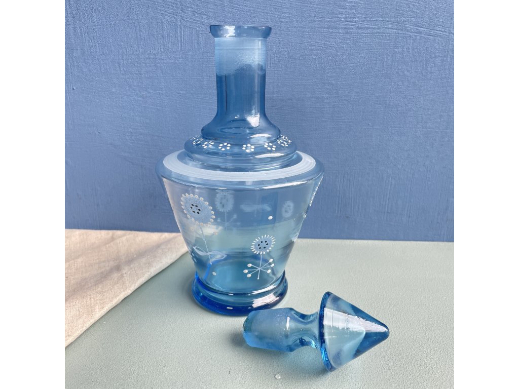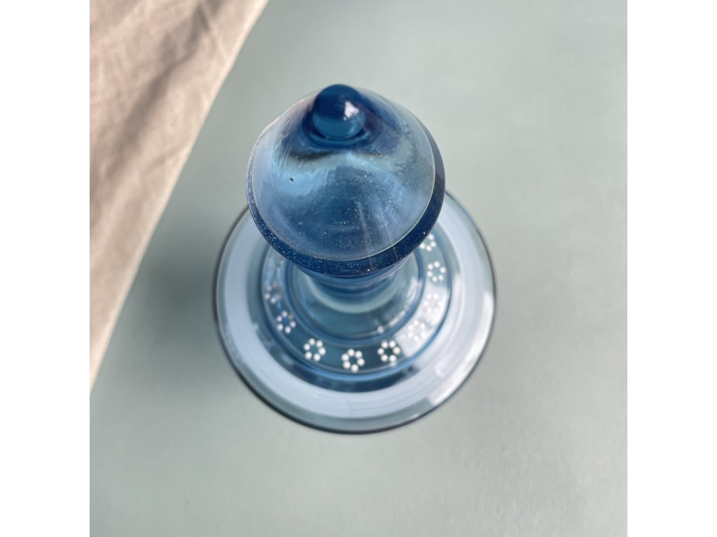 Výrazná modrá skleněná karafa s víčkem představuje dekorativní a zároveň praktický kousek.