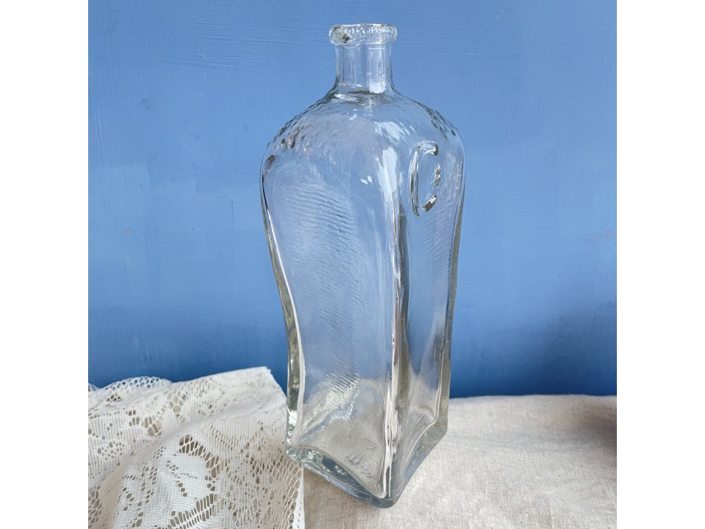 Skleněná lahev má elegantní, lehce zvlněný tvar se čtvercovým půdorysem, který směrem vzhůru plynule přechází do zaoblených ramen a úzkého hrdla.