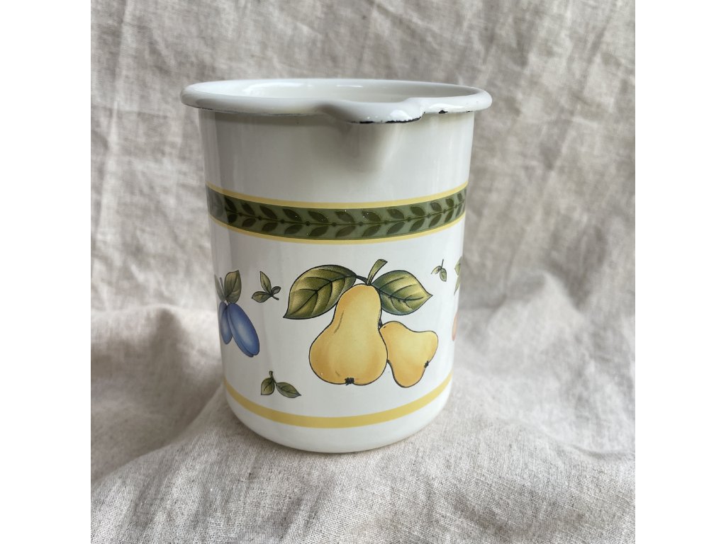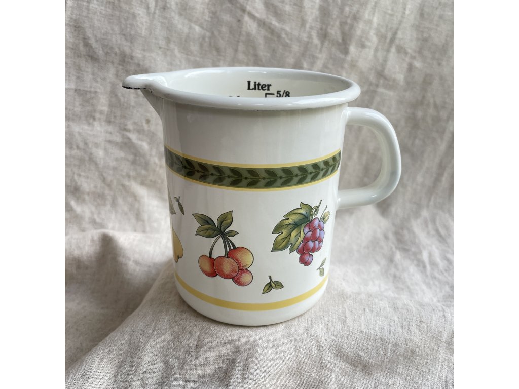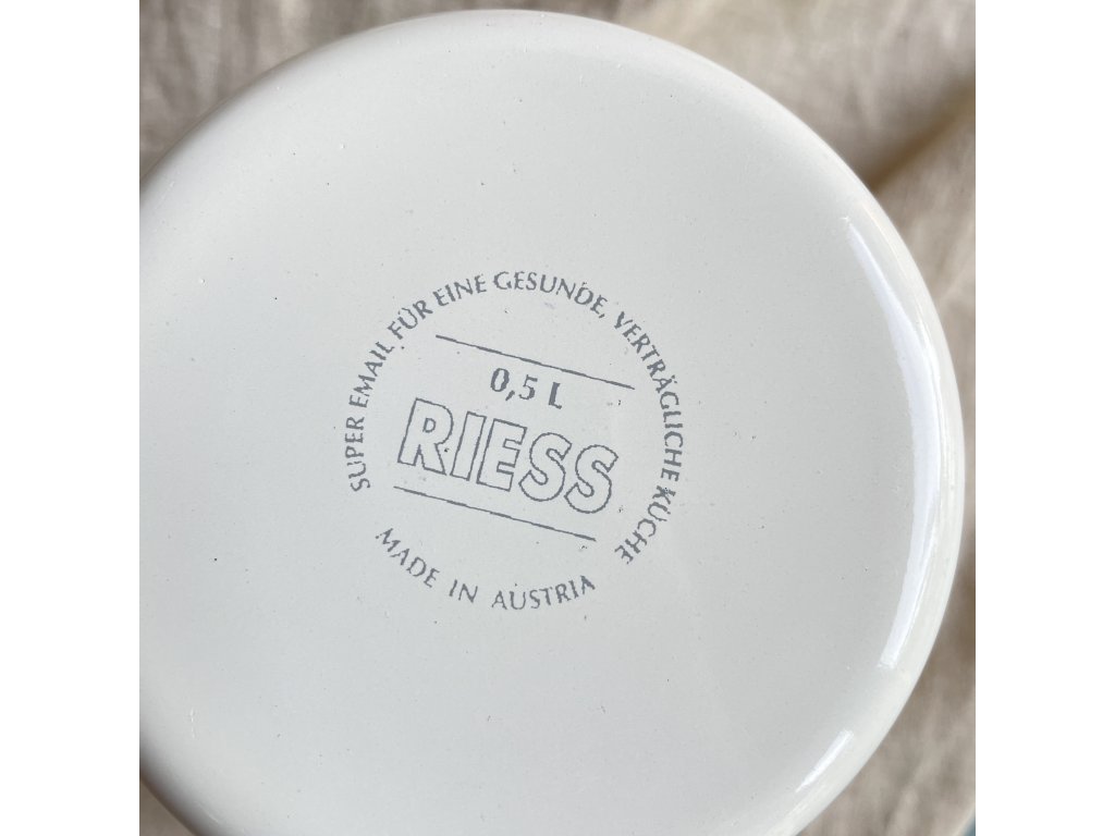 Smaltovaná odměrka o objemu 0,5 litru pochází z rakouské manufaktury Riess, známé výrobou kvalitního smaltovaného nádobí s dlouhou tradicí sahající až do konce 18. století.