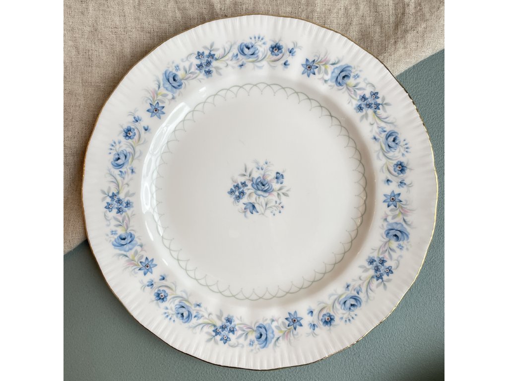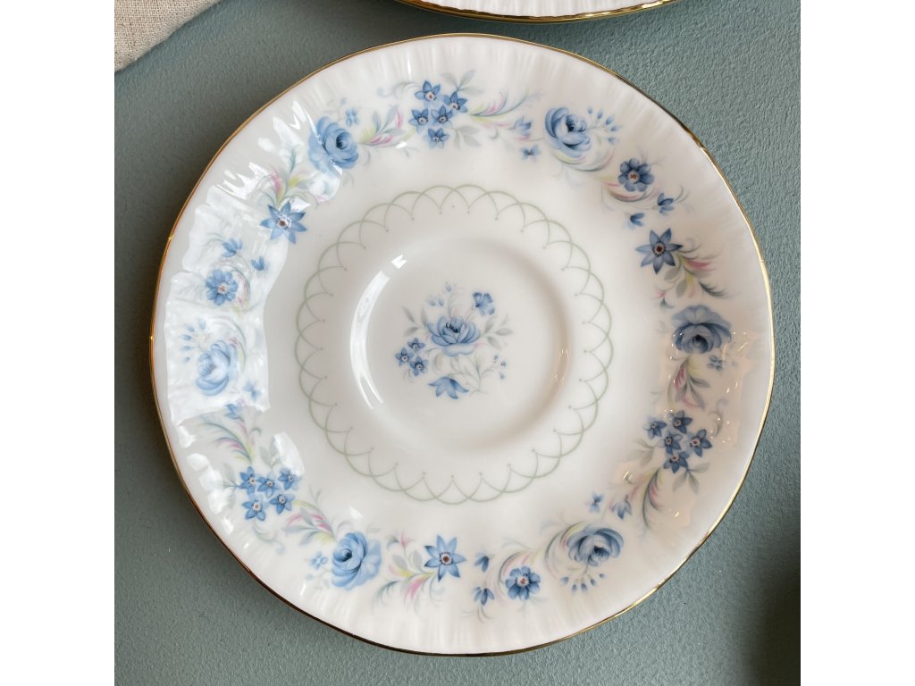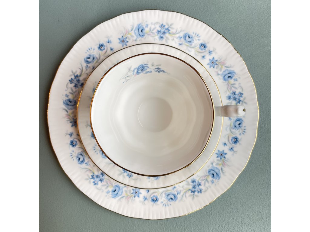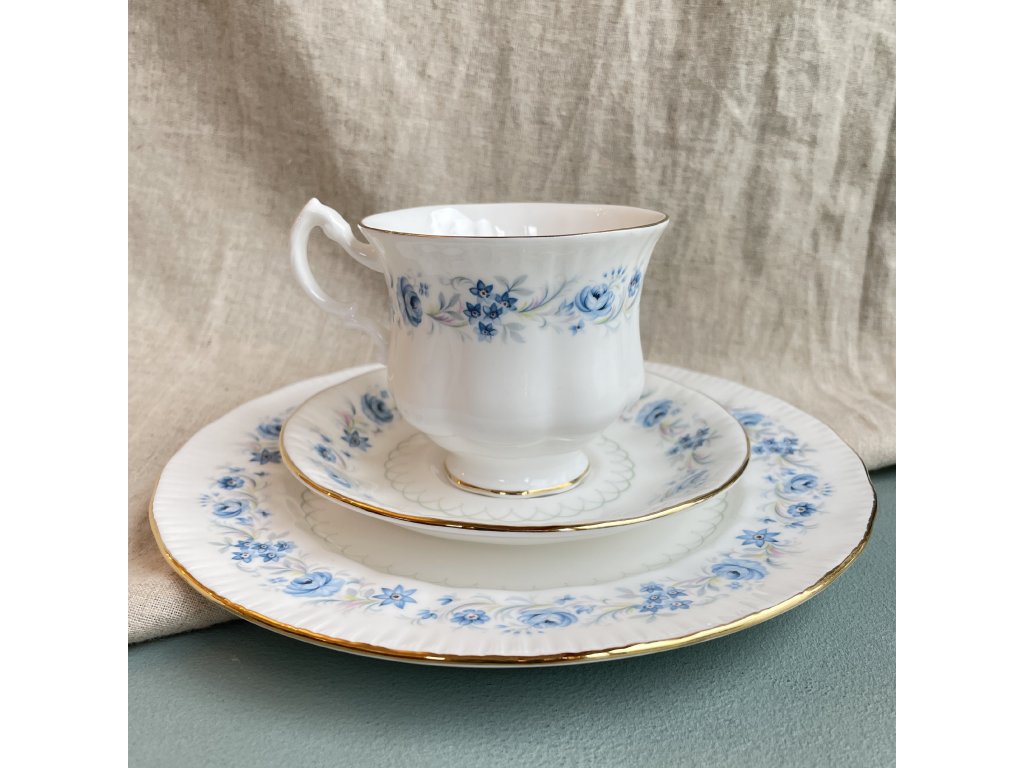 Souprava sestává z šálku, podšálku a dezertního talířku, které spojuje harmonický design v odstínech modré a světle zelené s drobnými růžemi a kvítky zimolezu.
