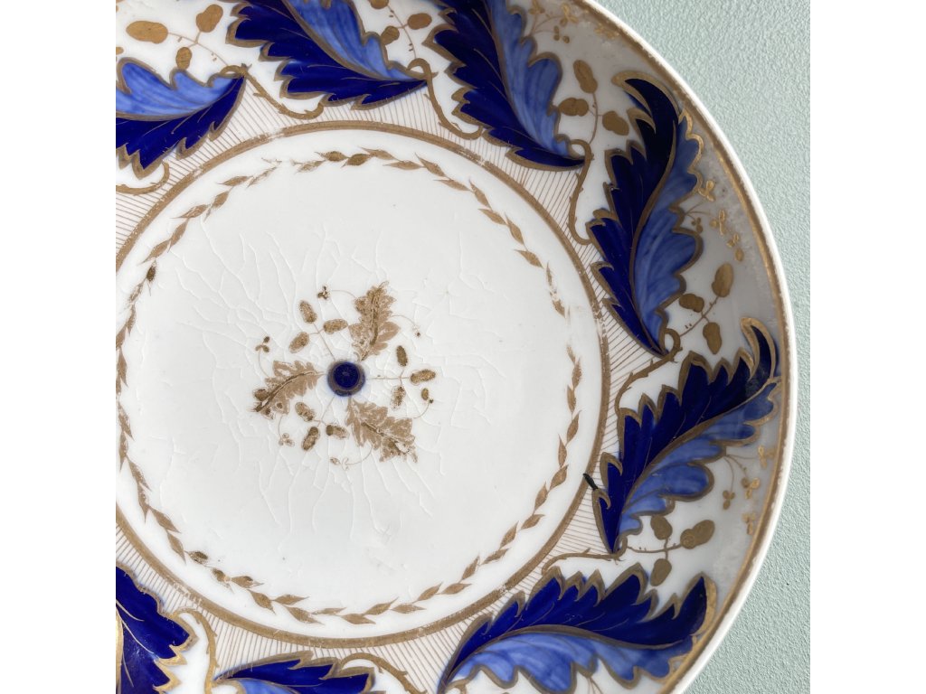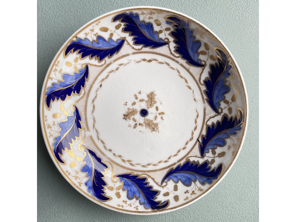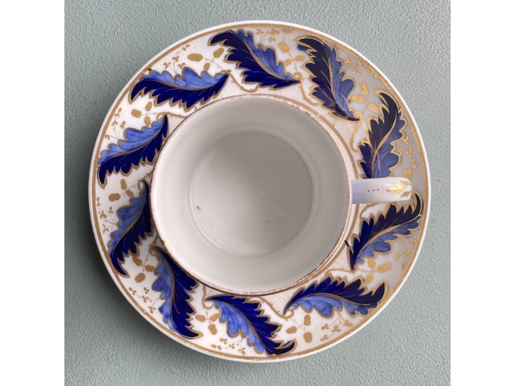 Obě části – šálek i podšálek – jsou bohatě zdobeny sytě modrými rostlinnými motivy, doplněnými zlatými detaily a tenkými zlatými linkami.