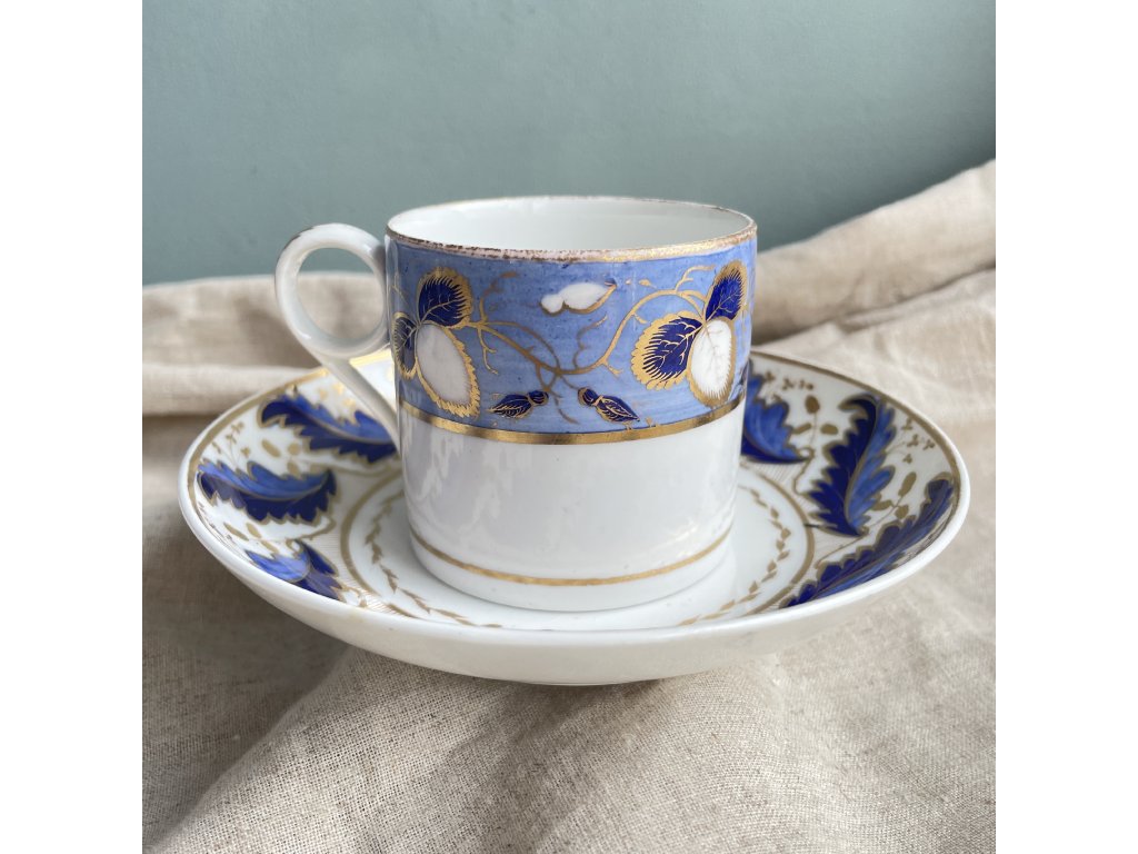 Šálek s podšálkem je vyroben z jemného porcelánu a nese známky ručního dekoru typického pro 19. století, patrně z Anglie.