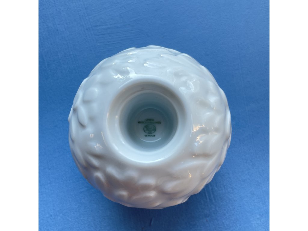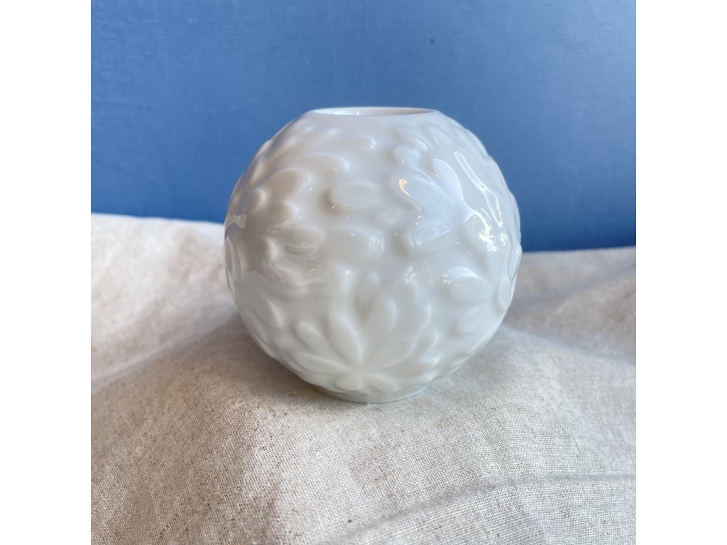 Celý povrch je pokryt lesklou bílou glazurou, která podtrhuje jemnost tvarování a světelné odlesky na plastickém motivu.