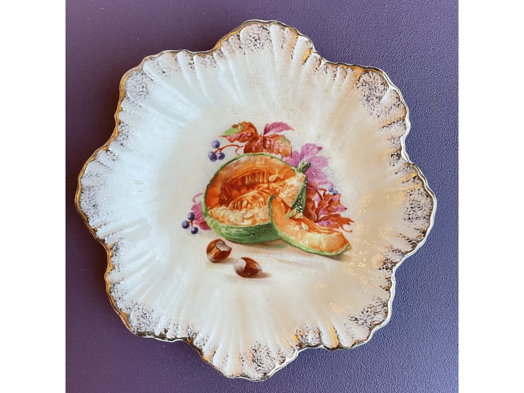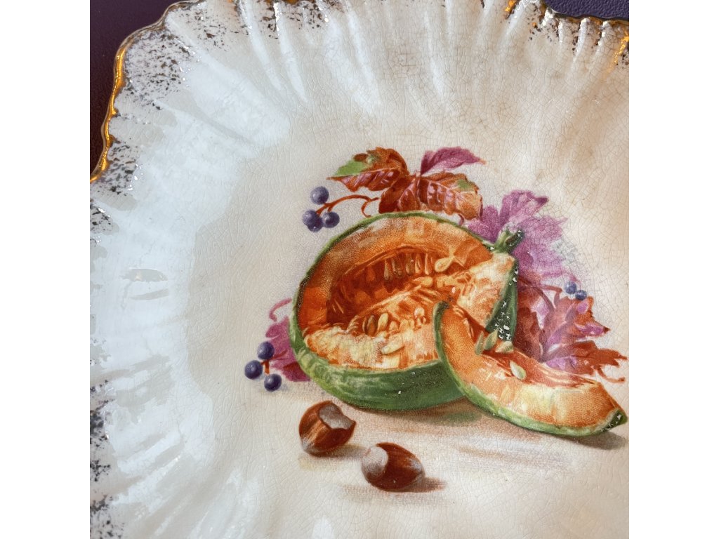 Střed talířku je zdoben detailní malbou rozkrojeného melounu v sytých oranžových a zelených tónech, doplněnou drobnými plody, semínky a květy v růžových a fialových odstínech.