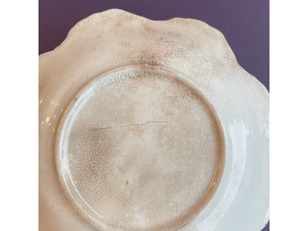 Dekorativní keramický talířek s výrazně zvlněným, mušlovitě tvarovaným okrajem zaujme jemnou krakeláží glazury, která vytváří bohatou síť drobných prasklinek po celé ploše.