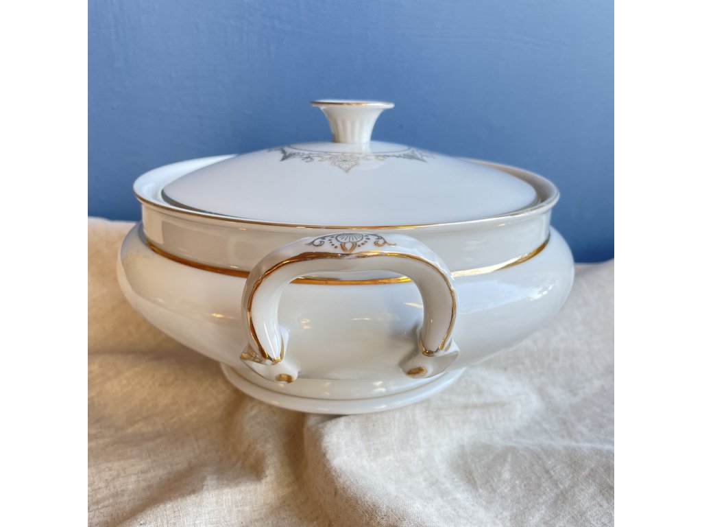 Mísa s víkem je elegantní porcelánová nádoba s jemným zlatým dekorem, vhodná především pro servírování teplých pokrmů, zejména polévek, omáček nebo dušených jídel.