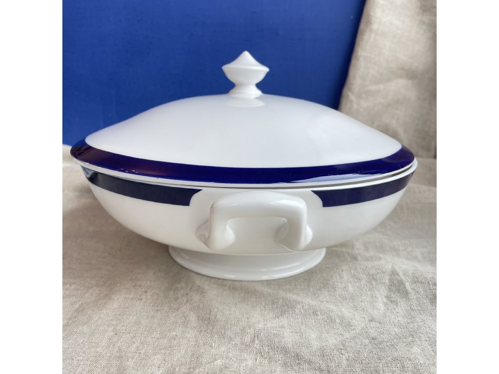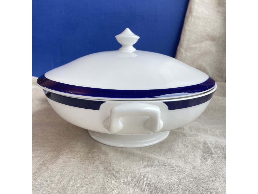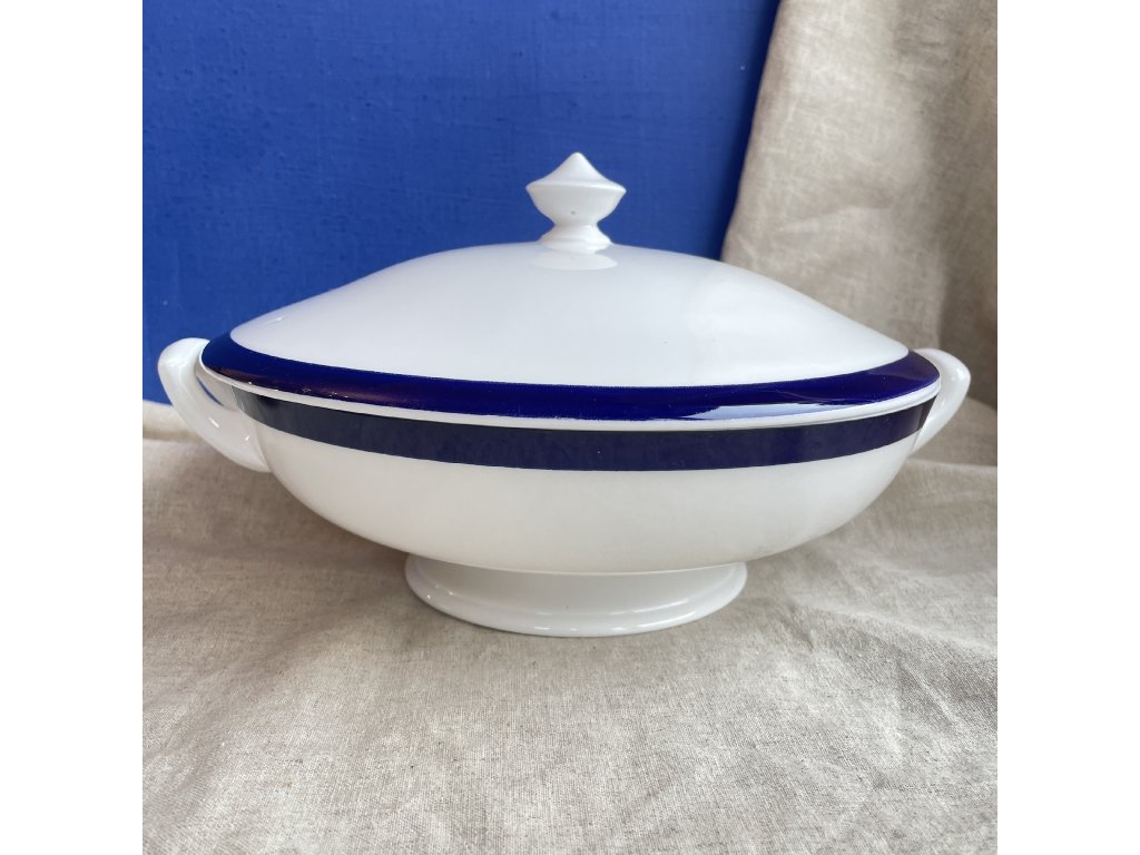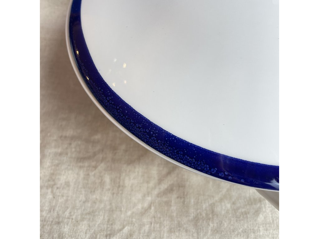 Základ tvoří hladký bílý porcelán s vysokým leskem, který je po obvodu zvýrazněn širokým tmavě kobaltovým pruhem.