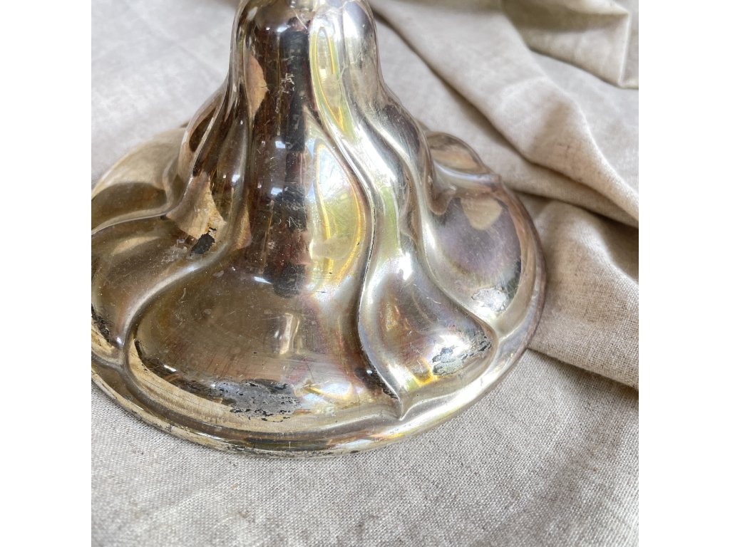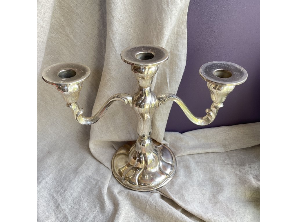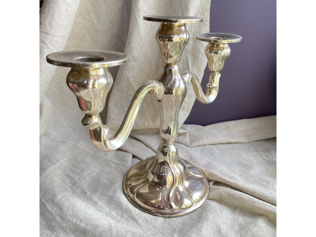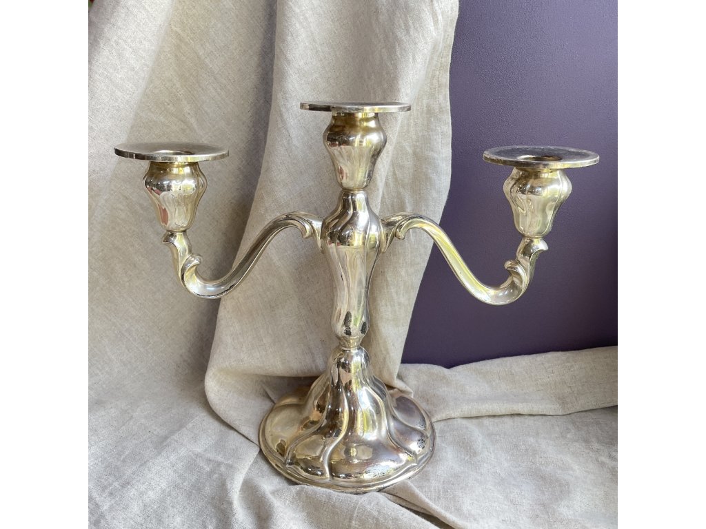 Tříramenný svícen je elegantním příkladem klasického stříbřeného stolního doplňku z první poloviny 20. století, vyrobeného pravděpodobně z mosazi či jiného neželezného kovu s vrstvou stříbra.