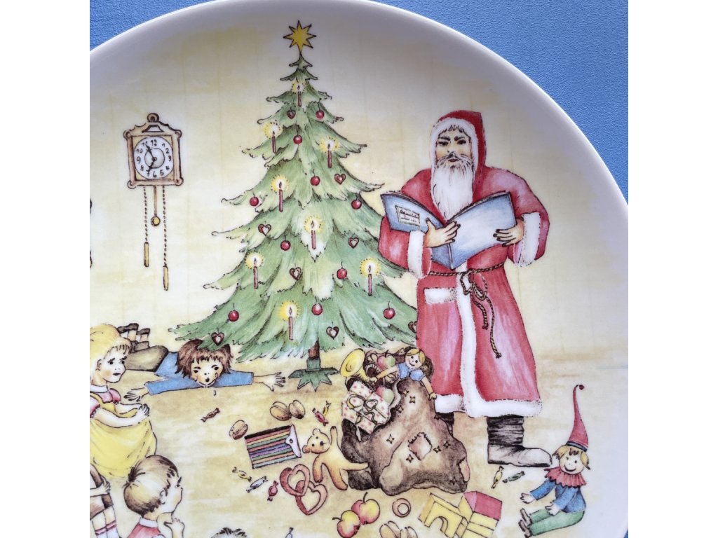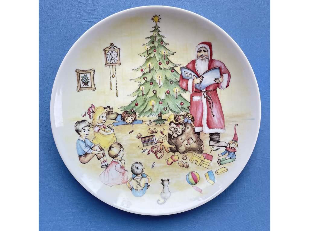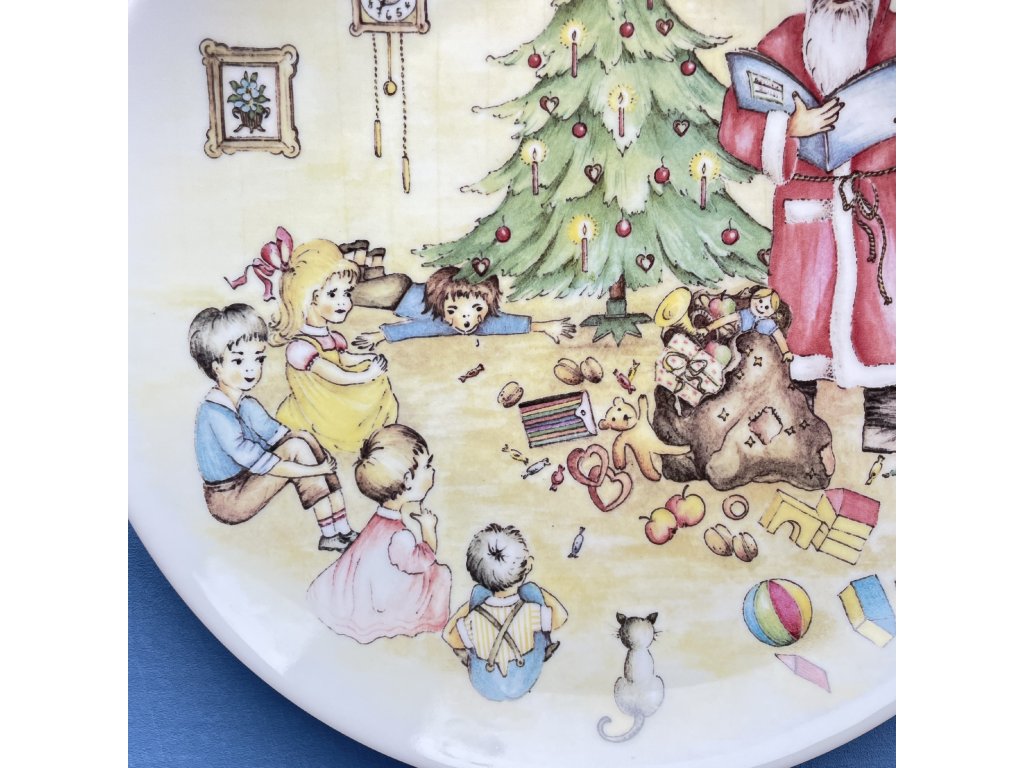 Scéna na talíři zachycuje idylickou vánoční chvíli uvnitř domácnosti – děti sedí v kruhu u ozdobeného vánočního stromku, pod kterým leží množství hraček, ořechů a dalších dárečků.
