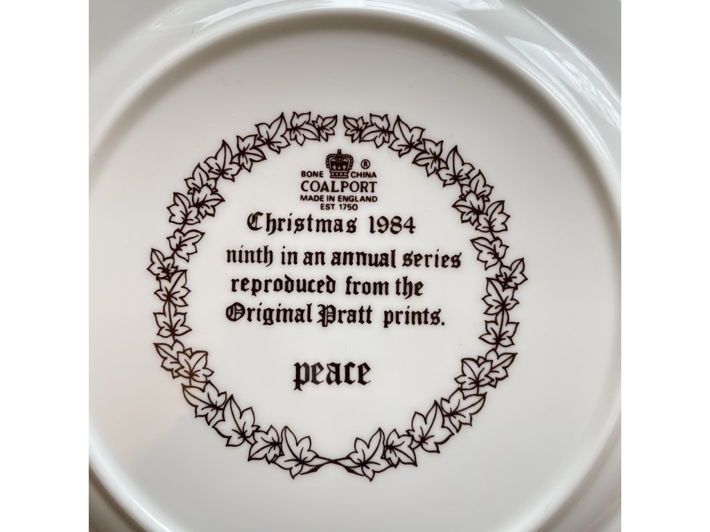 Vánoční talíř z roku 1984 je devátým v každoroční sběratelské sérii porcelánky Coalport, která byla založena v Anglii v roce 1750 a specializuje se na výrobu kvalitního kostního porcelánu.