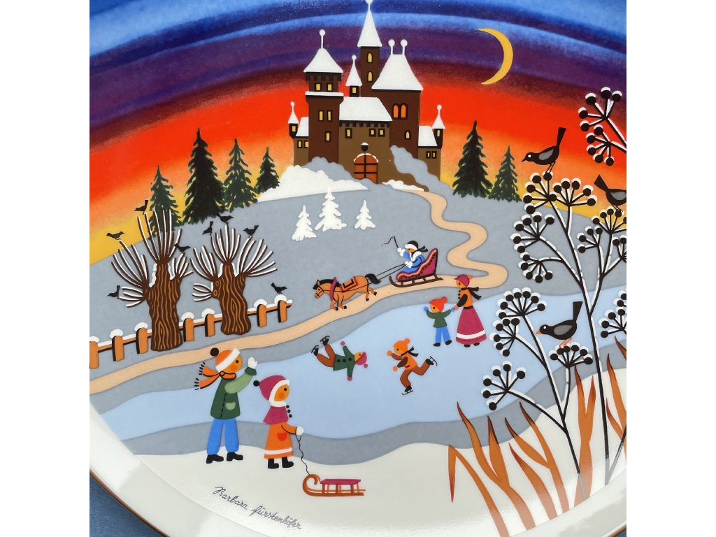 Na přední straně talíře je bohatě barevná zimní scéna, která zaujme především svou výraznou stylizací a kontrastním barevným pozadím.