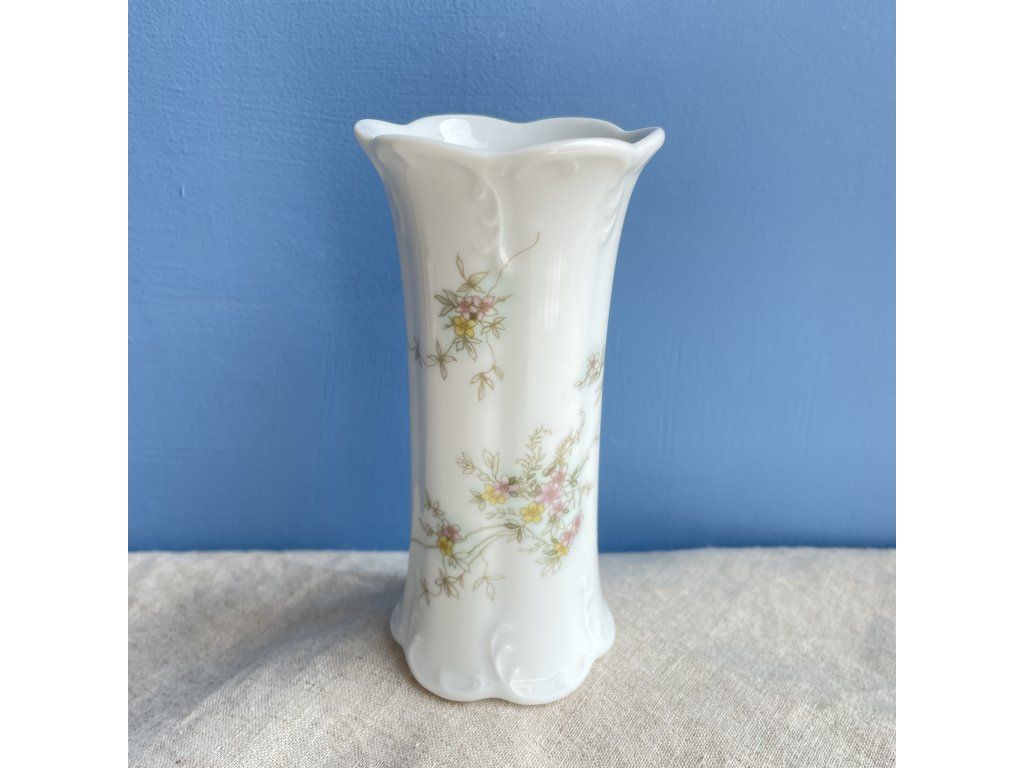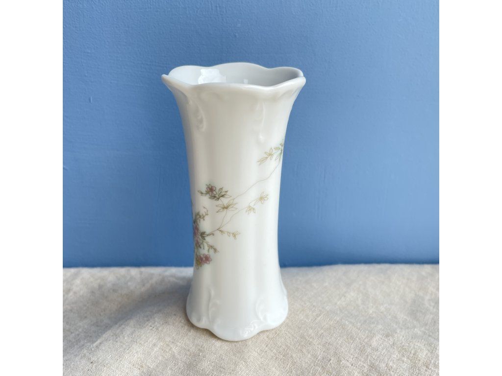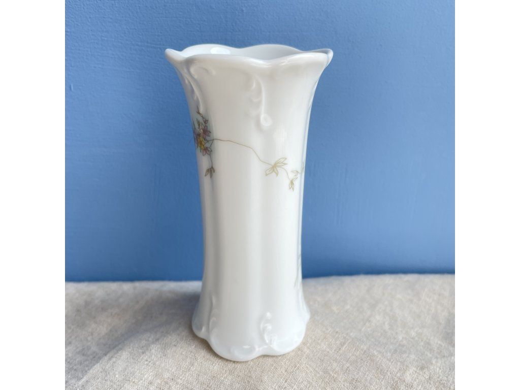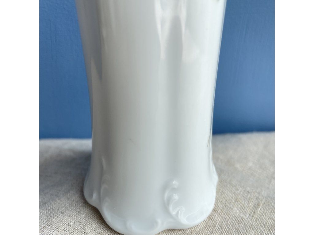 Elegantní porcelánová váza štíhlého, vysokého tvaru s jemně modelovaným, zvlněným okrajem, který plynule přechází do lehce kanelovaného těla.