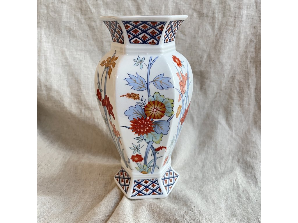 Váza má výrazný šestihranný tvar se širokou základnou a rozevírajícím se hrdlem, přičemž horní i spodní lem je zdoben geometrickým motivem v červeno-modro-bílých barvách, připomínajícím orientální styl.