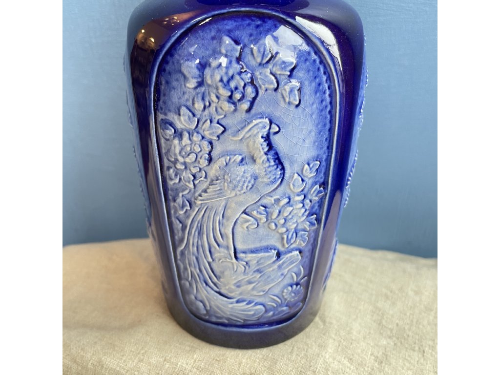 Váza je zhotovena v sytě kobaltově modré glazuře, přičemž plastický dekor je zvýrazněn světlejší patinou – tzv. highlighting, který podtrhuje detaily v reliéfu.