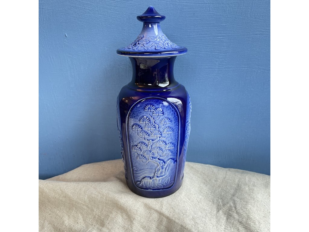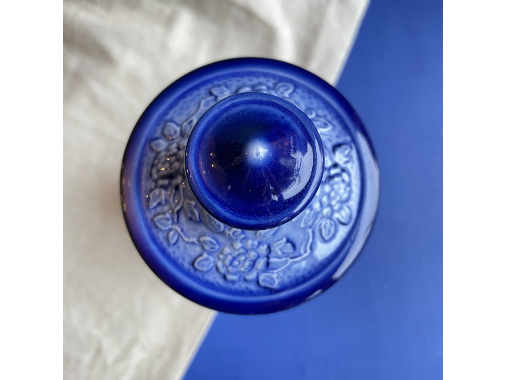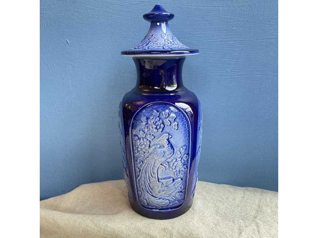 Dekorativní váza s víkem je výrazným příkladem anglické keramiky značky SylvaC, která se specializovala na ozdobnou kameninu.
