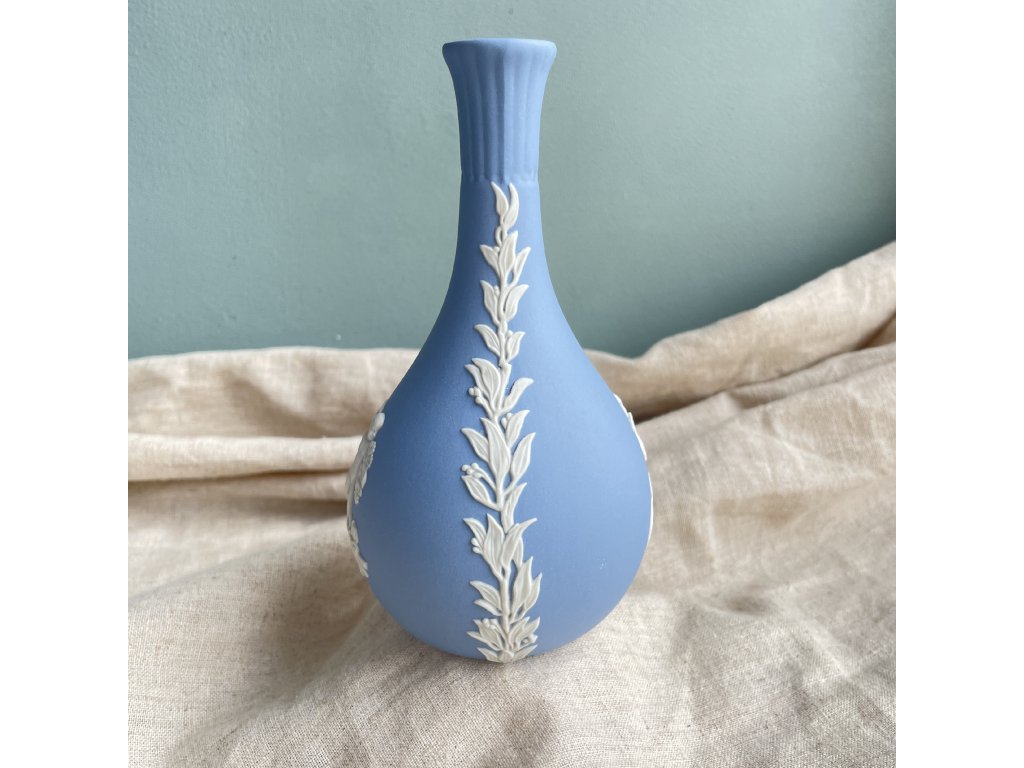 Elegantní malá váza je vyrobena z ikonického modrého „jasperware“ porcelánu, typického pro britskou značku Wedgwood.
