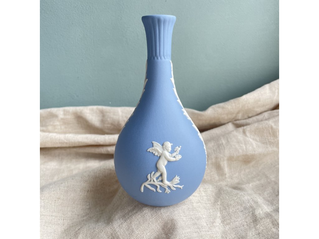 Povrch vázy je ozdoben klasickými bílými reliéfy — jeden z nich znázorňuje okřídleného putta (andílka) s květinovým věncem, zatímco po celé výšce se vine symetrický ornament z listů a květin, typický pro antikizující styl Wedgwoodu.